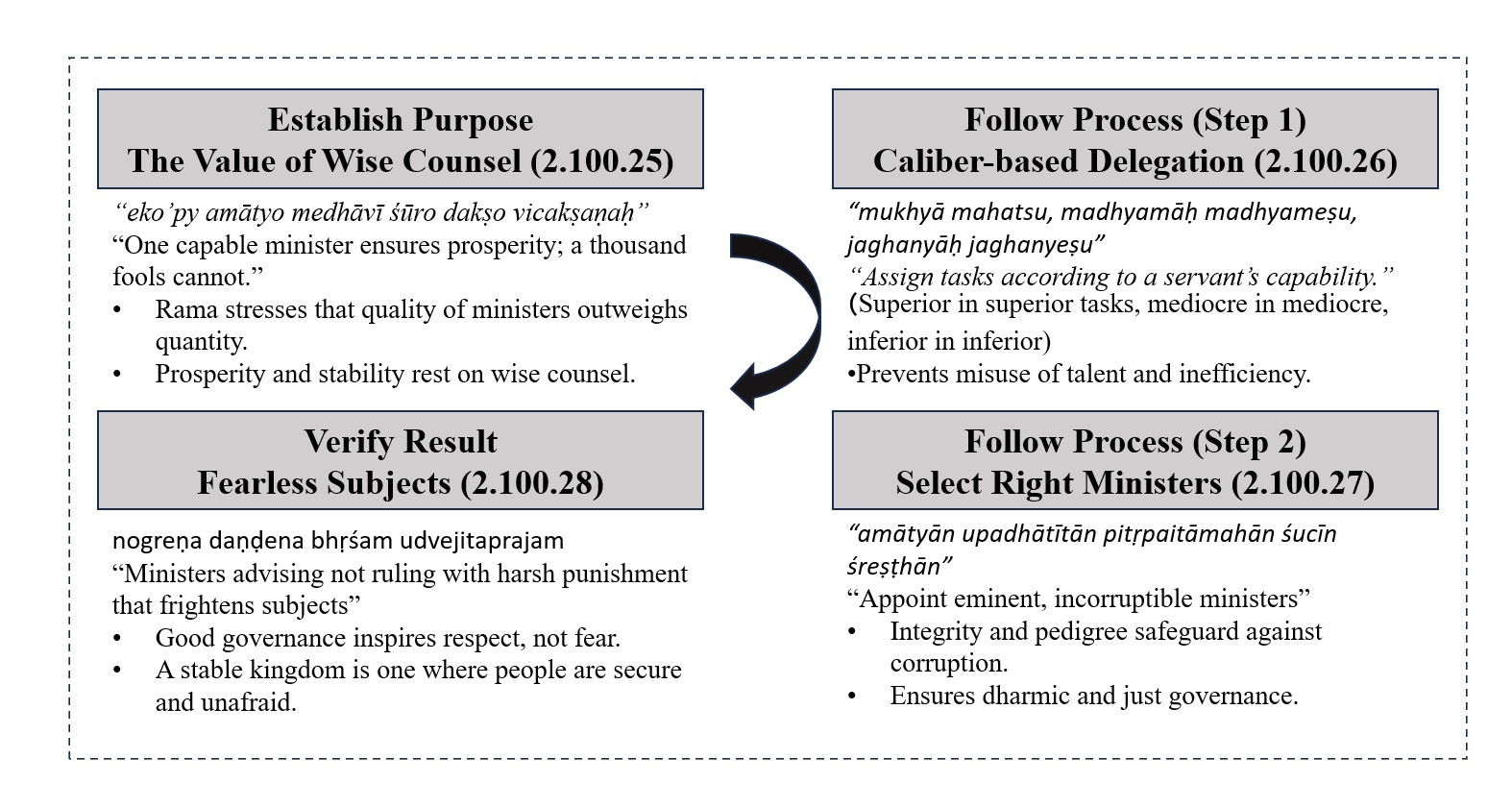 (Figure 1: Rāma’s Four-Step Framework for Statecraft (Ayodhyākāṇḍa 2.100.25–28) -A dharmic model of administrative planning, delegation, feedback, and ethical appointments—anticipating modern PDCA cycles.)