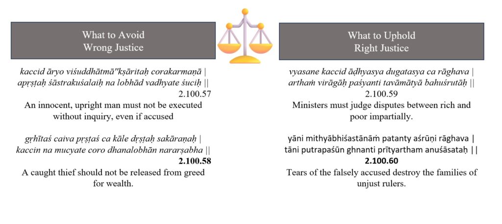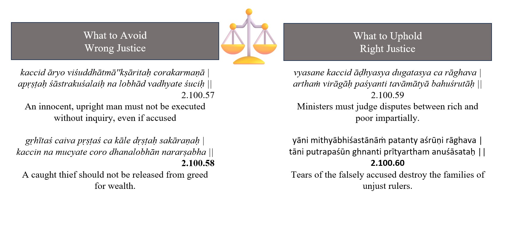 This ethic of justice deepens in verses 2.100.57–60, where Rāma warns against wrongful punishment and urges impartiality in judicial conduct. The attached figure contrasts wrong justice—driven by greed or haste—with right justice, rooted in inquiry, fairness, and compassion.