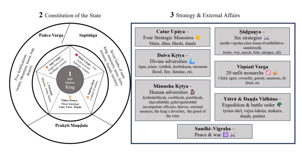 A comprehensive framework of ethical kingship, integrating wisdom, humility, valor, and skill with strategic foresight, social responsibility, and cosmic alignment.)