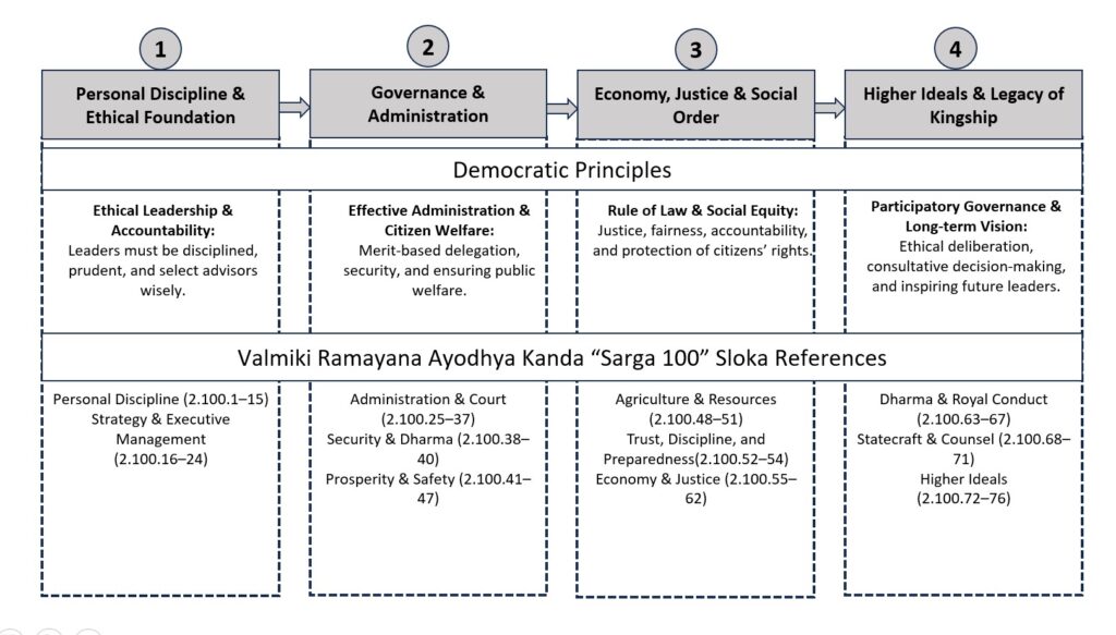 (Figure 5: Four Pillars of Statesmanship – Rāma’s Kuśala Praśnas mapped to modern democratic principles – A thematic synthesis of ethical leadership, governance, justice, and visionary kingship drawn from Ayodhyākāṇḍa Sarga 100.)