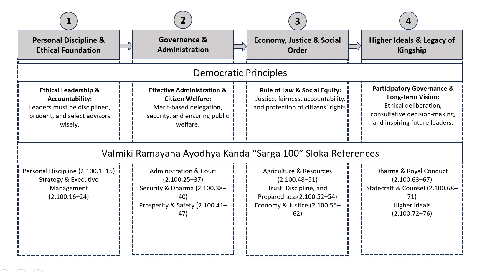 Taken together, these four pillars reveal how Rāma, through fraternal dialogue, distilled a comprehensive architecture of statecraft. His kuśala praśnas weave together personal ethics, administrative order, economic justice, and visionary leadership—mapping seamlessly onto principles that remain central to democratic governance today.