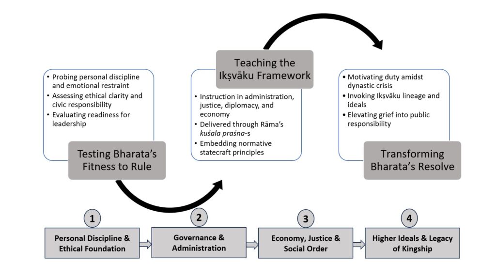 This architecture is not merely theoretical—it is pedagogical. Through the Citrakūṭa encounter, Rāma enacts a threefold process of political instruction: testing Bharata’s ethical fitness, teaching the Ikṣvāku framework of governance, and transforming his grief into public responsibility. This progression—Testing, Teaching, Transforming—reveals that statecraft in the Indic tradition is not imposed but awakened. It is transmitted relationally, through saṁvāda, and anchored in lineage, emotion, and dharma.