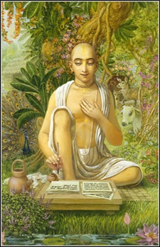 “While touring South India, Chaitanya encountered a certain Brahmin in the temple of Ranga-kshetra. This man daily sat in the temple turning over the pages of the Bhagavad-gita, but his constant mispronunciation of the Sanskrit made him the object of general mirth and derision. Chaitanya, however, observed signs of genuine spiritual ecstasy on the Brahmin’s body, and he asked him what he read in the Gita to induce such ecstasy. The Brahmin replied that he didn’t read anything. He was illiterate and could not understand Sanskrit. Nevertheless, his guru had ordered him to read the Gita daily, and he complied as best he could. He simply pictured Krishna and Arjuna together on the chariot, and this image of Krishna’s merciful dealings with his devotee caused this ecstasy. Chaitanya embraced the Brahmin and declared that he was an “authority on reading the Bhagavad-gita.”[1]