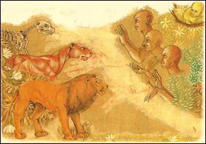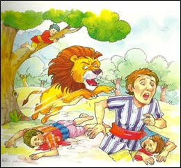 The third scholar said, “I can give life to this animal and make it alive!” Everyone seemed impressed. But, the fourth friend, who was not very scholarly, immediately stopped them and said, “Do not be foolish. A lion eats human beings. If you make it alive, it will pounce on us and eat us.” But the three did not listen to him. However, he begged them to allow him to climb a tree before they make him alive. They agreed.