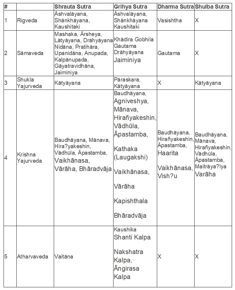 The following chart gives some of the major surviving Kalpasutras related to the different Vedas: