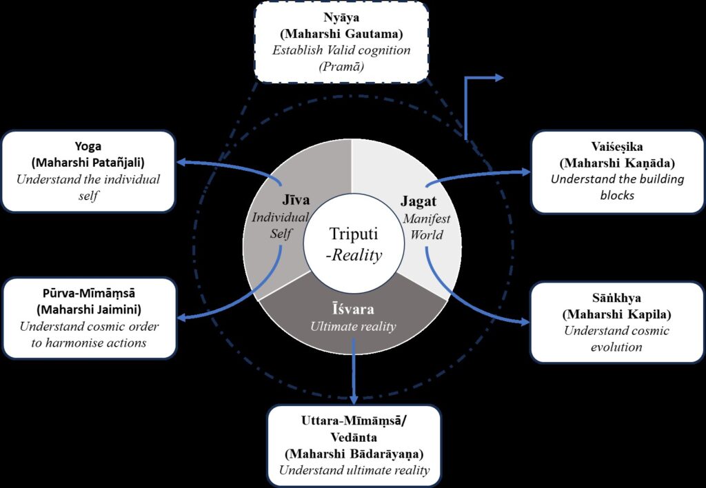 Across the world, physicists and philosophers alike have long sought a “theory of everything” — a single framework that explains the origins, structure, functioning, and eventual dissolution (pralaya) of reality. While modern science continues its search through cosmology, quantum mechanics, and neuroscience, ancient India developed an integrated and remarkably comprehensive knowledge architecture over several millennia ago: the Ṣaḍ-Darśanas, the six classical schools of Indian philosophy. Far from being isolated traditions, these systems collectively form an integrated framework to visualize reality — what can be seen as an original ‘theory of everything’ — offering a holistic understanding of consciousness, matter, and mind, the tripuṭi at the heart of all experience, and their dynamic interplay culminating in causality and liberation.