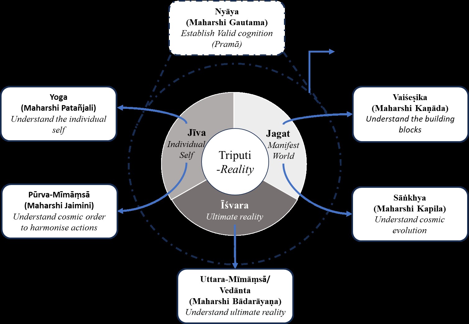 The Ṣaḍ-Darśanas can be understood as a modular system, where each school addresses a distinct domain of the tripuṭi — jīva (individual self), jagat (manifest world), and īśvara (ultimate reality) — yet all are interdependent, forming a unified architecture of knowledge (Fig 1). This perspective reveals that the darśanas are not isolated philosophies but interlinked modules, each providing unique insights while relying on shared assumptions such as karma, dharma, and mokṣa.