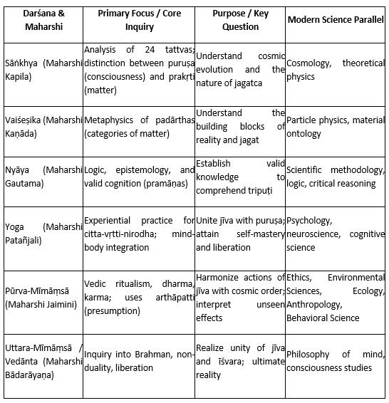 This integrated view of the Ṣaḍ-Darśanas sets the stage for a detailed comparison of each school’s focus, purpose, and modern parallels (Table 1).