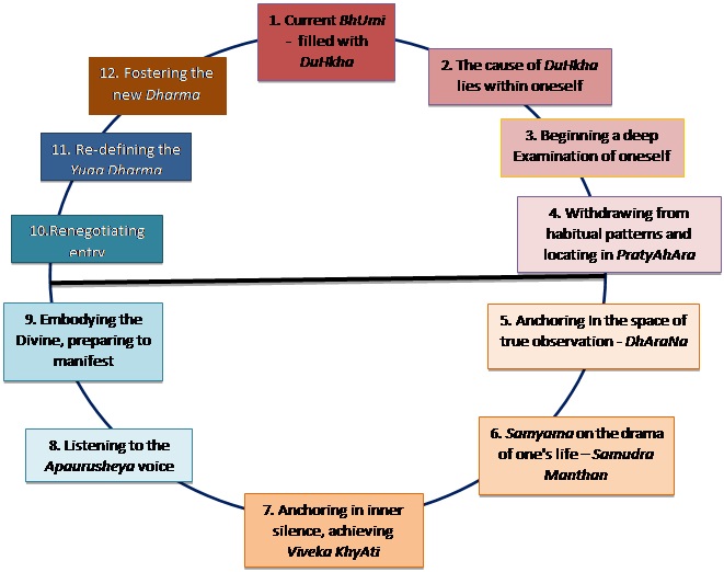 - The realisation that the cause of the DuHkha is within and not outside and recognising the inner structures that cause DuHkha. This leads to an enquiry “What is Dharma? What is kartavya?”