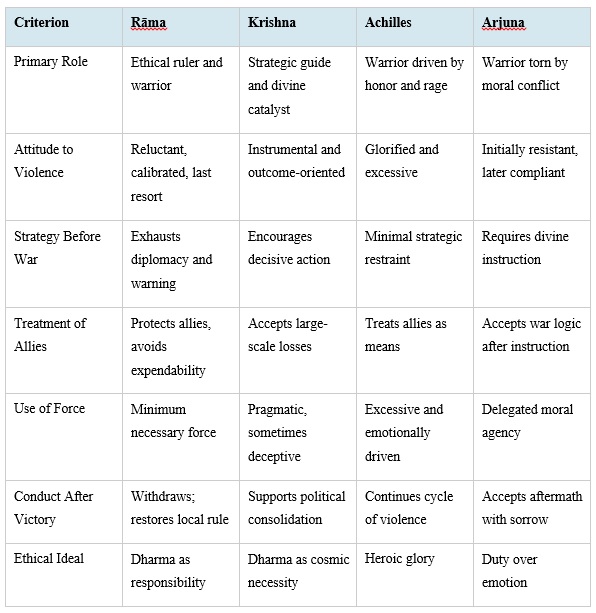 Table 1 compares Rāma’s ethical framework with three other prominent warrior figures from Indian mythology: Krishna, Achilles, and Arjuna.
