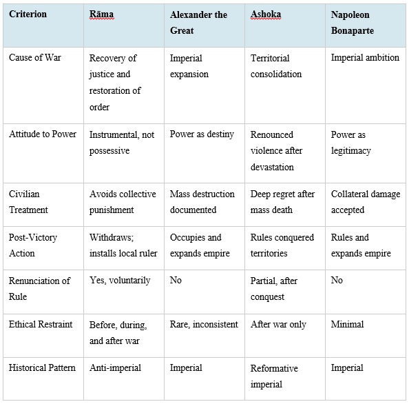 Table 2 compares Rāma’s conduct with that of historical warrior-rulers, revealing the distinctiveness of his approach to power, conquest, and post-war governance.